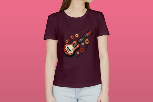 Regular price Rs. 499.00Regular priceUnit price / perRs. 1,100.00Sale price Rs. 499.00Guitar Maroon Printed Regular Fit Women T-Shirt